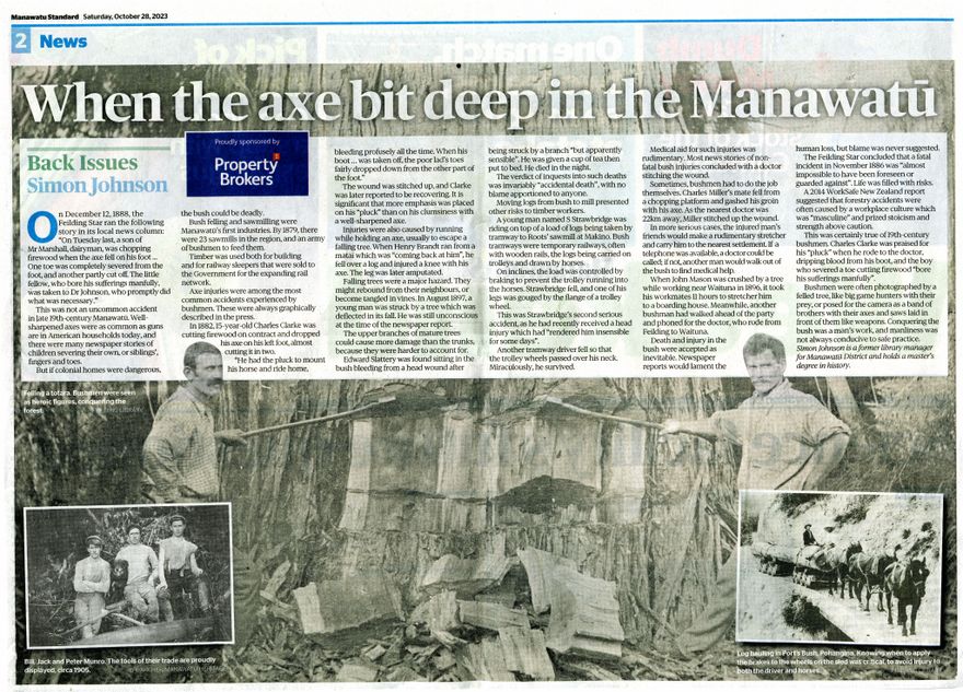Local historians weekly "Back Issues" article in the Manawatū Standard. Injuries and fatalities caused by boys and men using well sharpened axes were common in the late 19th century, with many workers involved with bush clearing. Bush felling and saw milling were Manawatū's first industries. Medical aid was often carried out by the bushmen themselves, with no nearby doctors or medical centres.
