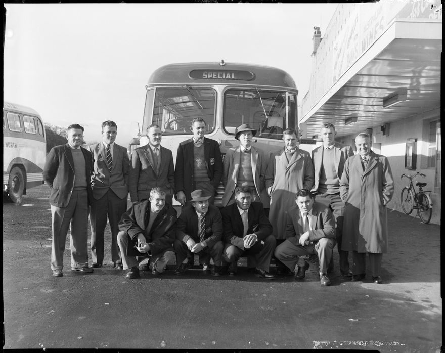 This image was taken for a story that ran in The Manawatu Evening Standard on 23 May, 1959. "The Palmerston North members of the Manawatu Rugby team to play Wanganui are seen prior to leaving for the River City this morning. Standing on the left is the chairman of the selection panel (Mr V. C. Holland) and on the extreme right (standing) is Mr G. Edmonds, a member of the union. The Feilding players were picked up on the journey."