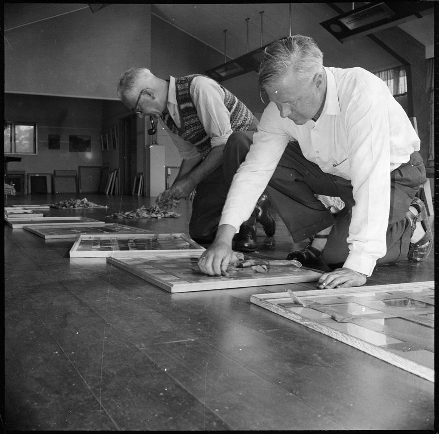 This image was taken for a story that ran in The Manawatu Evening Standard on 14 January 1961: "Assistants were busy this morning at the Palmerston North art gallery preparing water-colour paintings by John Gully for exhibition. All painting deal with the early days in New Zealand."