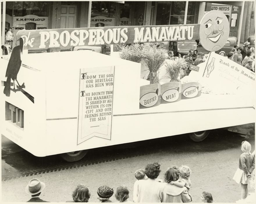 In 1952, Palmerston North celebrated 75 years since being proclaimed a Borough. A parade of decorated floats was part of the week long celebrations. This float was entered by Hodder and Tolley.