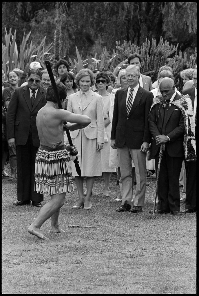 This image was taken by the Evening Standard on the 11th of February 1984 but was not published. It depicts former United States president Jimmy Carter and his wife Rosalynn during the wero at Parewahawaha Marae in Bulls.