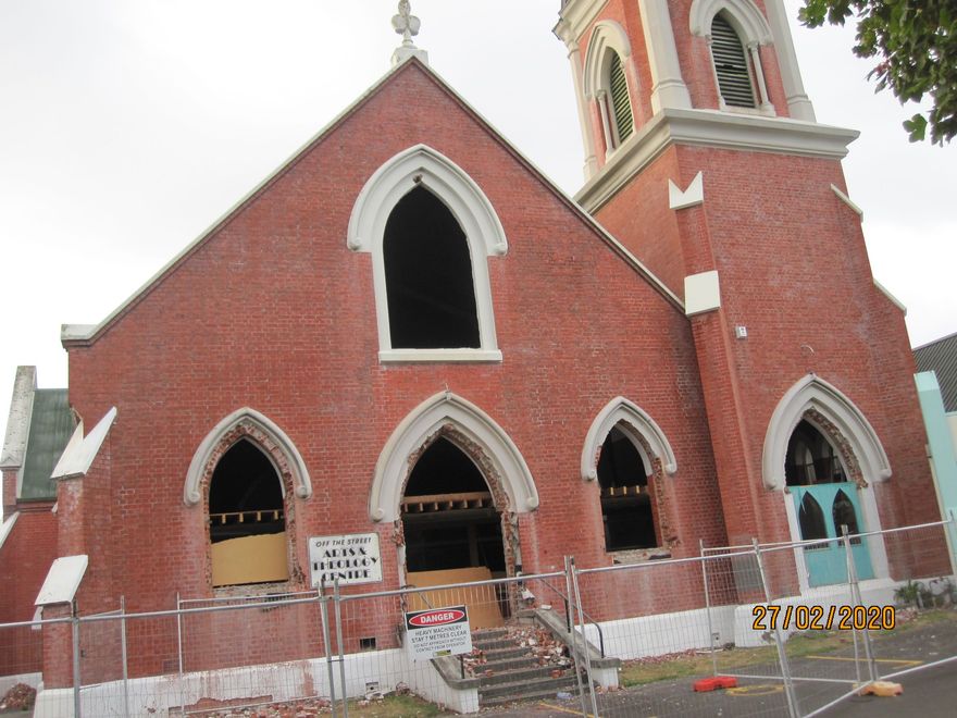 The Wesley Methodist Church in Broadway was deemed an earthquake risk after the Christchurch earthquakes. It was demolished in 2020. The brick church was designed by James Bennie in 1911.