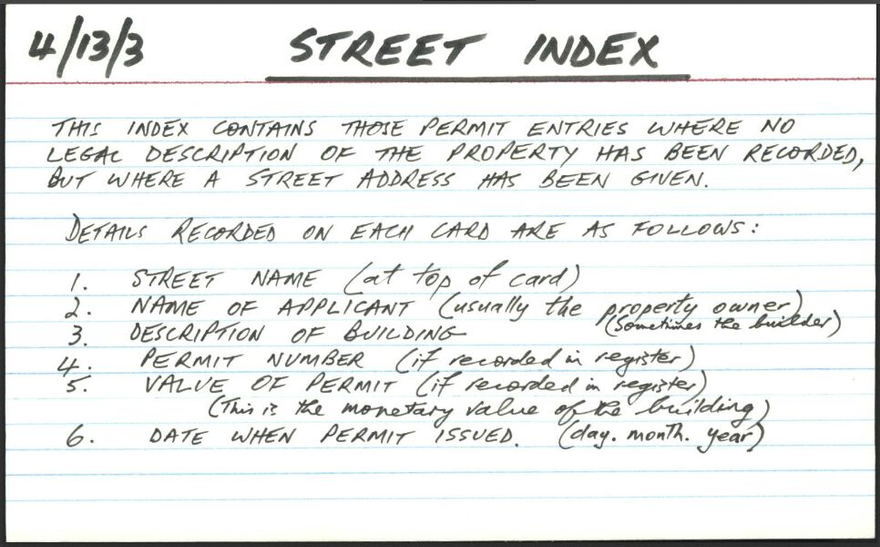 The Section Index contains those permit entries recording the section number and allotment (lot) number of the property for which the permit has been issued. These section numbers are part of the legal description of the land and are not the street address number(s) of the building concerned.