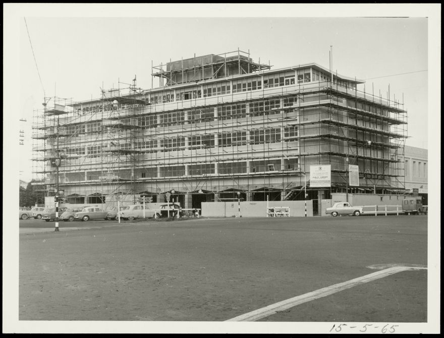A series of images spanning 4 May - 14 September, 1965, depicting the construction of the Public Library on the corner of Main Street and The Square. The library was officially opened on 4 November, 1965.