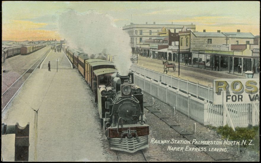 The Napier Express is shown leaving the Palmerston North Railway Station. This postcard shows the old Main Street Railway Station, which operated from 1890 to 1963.