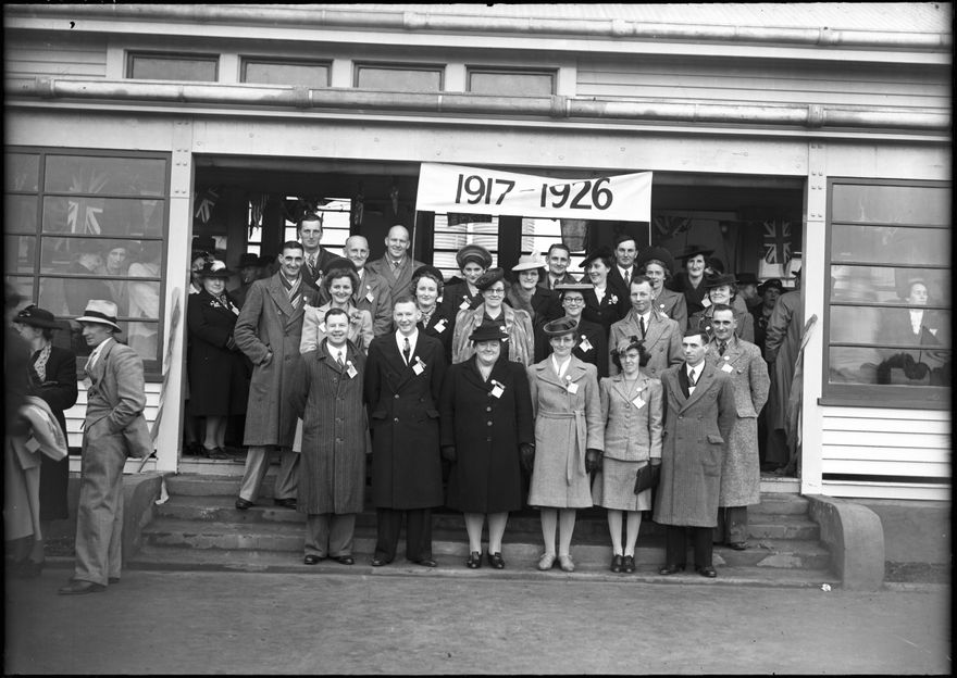 The class of 1917–1926 pose under the banner on the steps of Mangimare School during the school reunion. The 50th jubilee celebration was an occasion to include the official opening of the new school on 21st of June 1947. The old school which had been vacated was given a new lease of life in 1949 when it was re-erected in the new school grounds to be used as an assembly hall. In the mid-1970s Mangamaire Country School combined with Marima, Hukanui, Hamua, Konini and Nikau schools.