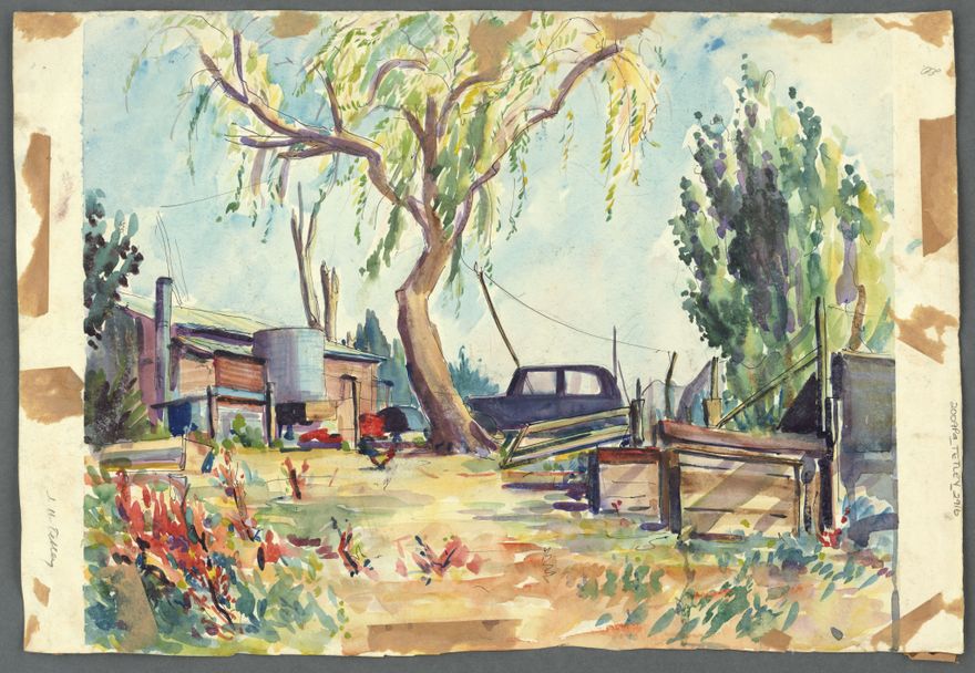 Painting of car in the backyard of a house. Pen and wash. Colour. John Tetley was a parasitologist at Massey Agricultural College and a well known amateur artist who exhibited locally.