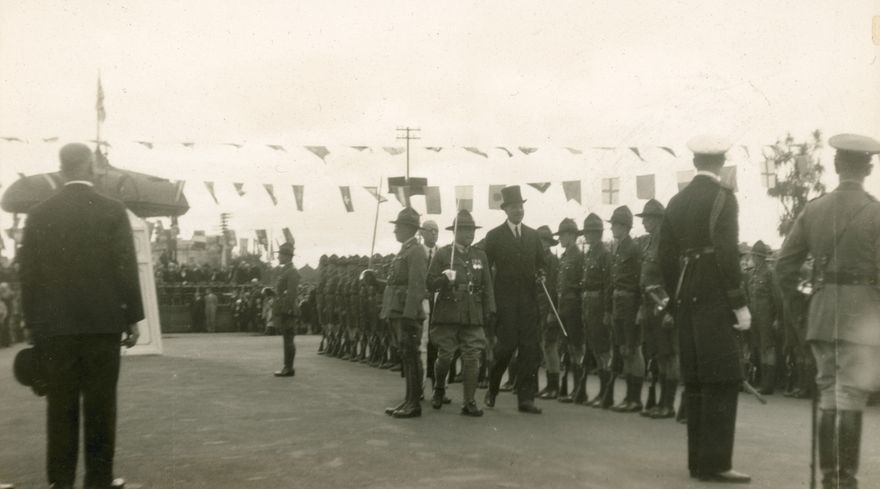 A civic welcome to Lord and Viscountess Galway in May 1935 after Lord Galway succeeded Lord Bledisloe as Governor General of New Zealand on 12 April 1935. He is shown here inspecting the troops. Lord Galway retired from New Zealand on 3rd of February 1941.