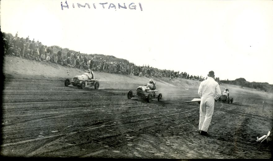 Racing at Himatangi Beach to the north on damp reed flats. A large crowd lines the track on the beach to watch.