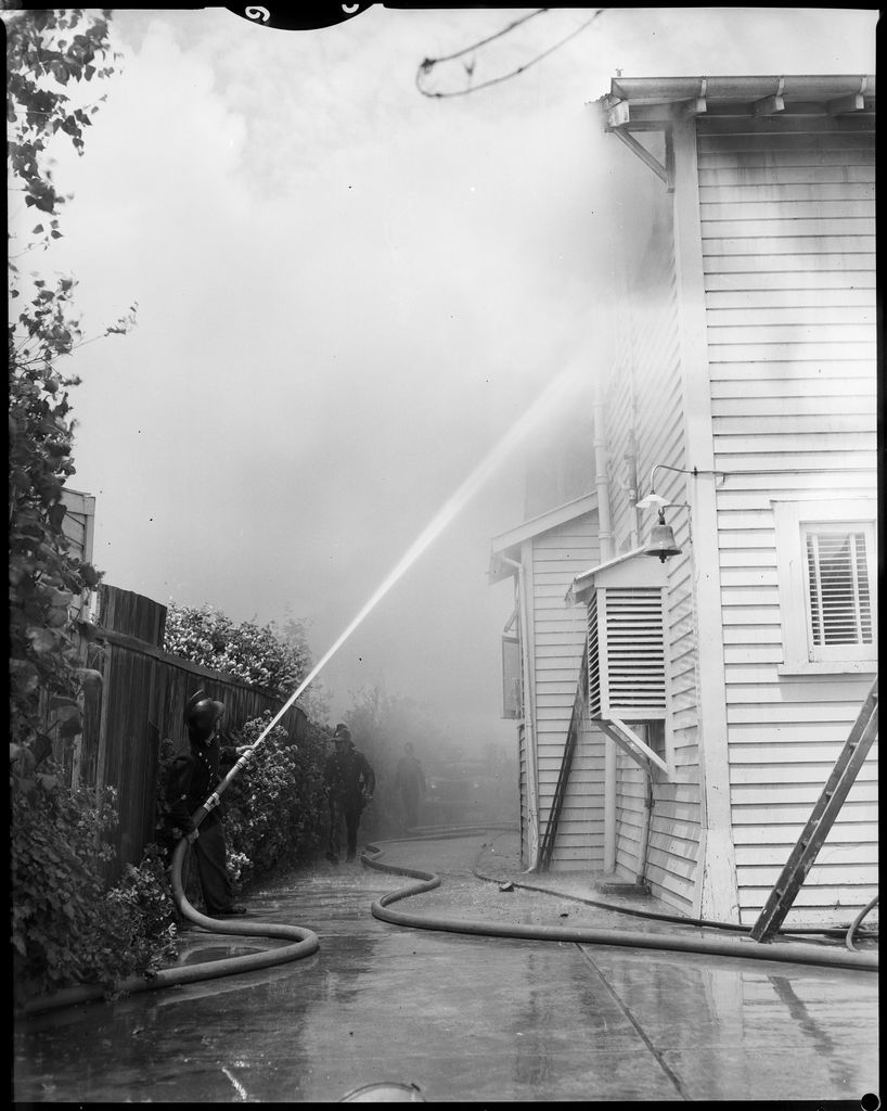[Side view of house with firemen and firehose aimed at blaze. Image not found in collection]