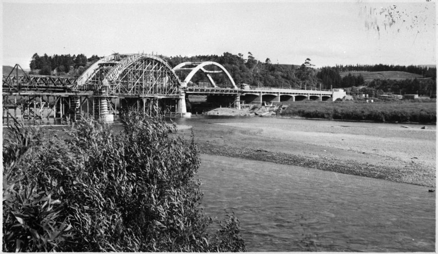 This photograph shows the construction of the middle arch of the second Fitzherbert Bridge. A third bridge was built in 1987 due to mounting traffic constraints. The view, taken from the Esplanade gardens, looks across to the Aokautere and Massey Agricultural College side.