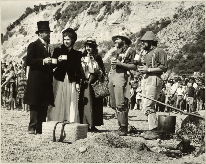 One of the events to celebrate 100 years of Palmerston North was a re-enactment of the landing of the first settlers in Palmerston North, who came down the Manawatu River from Foxton by canoe. From left: Ken Wynks as George Snelson (earlier settler and first Mayor of Palmerston North); Alison Stuart as Matilda Montgomery, the Snelsons 16 year old ward; Unknown
