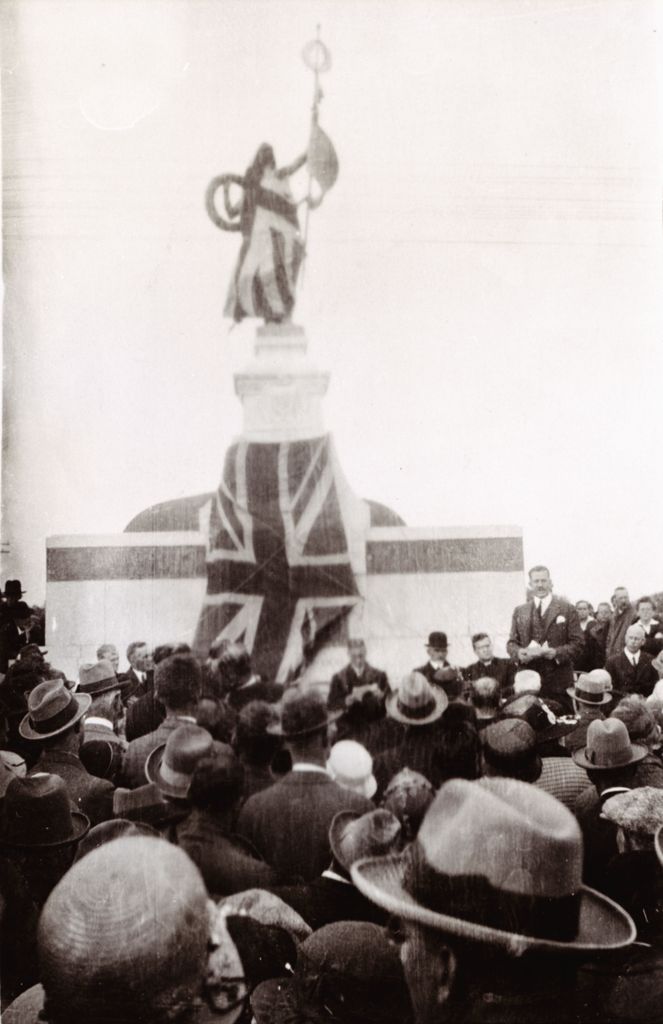 The Palmerston North cenotaph, constructed in the centre of The Square to commemorate those who died in World War One, was opened by the then Prime Minister Mr Gordon Coates. It was a replica of one in Folkstone, England. Standing speaking is Gordon Coates.