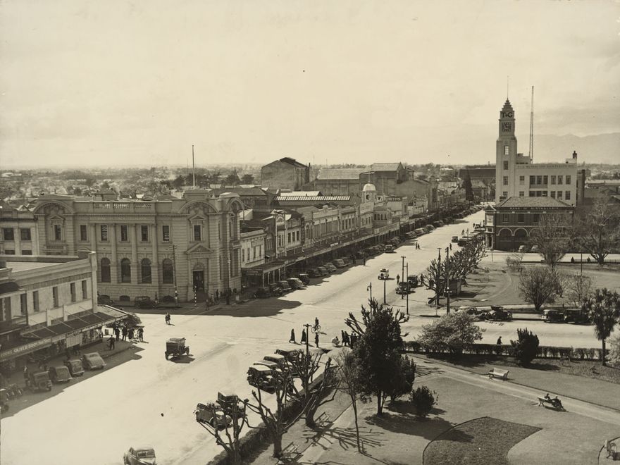 Overlooking 2 quadrants of The Square on the right. On the left can be seen the Clarendon Hotel and the Bank of New Zealand opposite each other on the corner of Rangitikei Street.