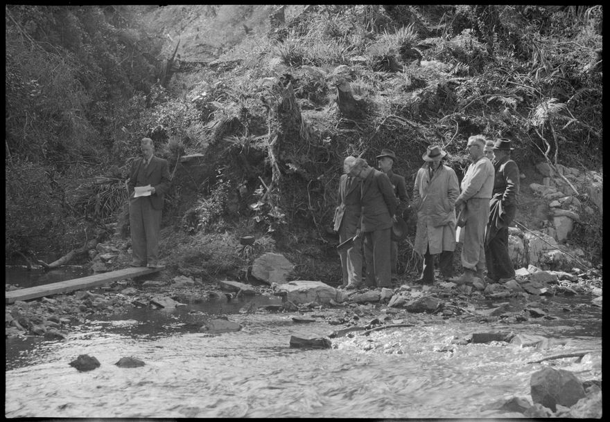 "Turitea dam G. Tremaine turning first sod. Groups with G. Hogg, Engineer and function on site at sod turning."