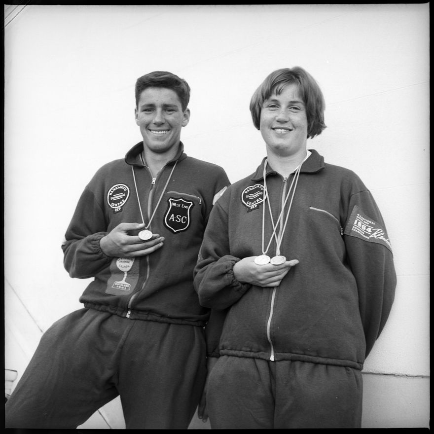 This image was taken for a story that ran in The Manawatu Evening Standard on 27 February, 1964. "I. Burt and Miss V. Toye, two Manawatu swimmers who won gold and silver medals at the New Zealand championships, at Blenheim, recently. Burt won the junior boys' 220 yards backstroke and Miss Toye the junior girls' 220 yards backstroke. Both gained second placings in the 110 yards backstroke."