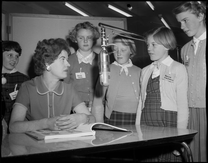 This image was taken for a story that ran in The Manawatu Evening Standard on 30 August 1961 "A group of the girls taking part in the Y.W.C.A. stay-at-home camp this week visited the 2ZA radio broadcasting station this morning. Above are three of the girls in the main studio chatting about their activities with Miss Mary Seaton, the new announcer in the women's hour programmes."