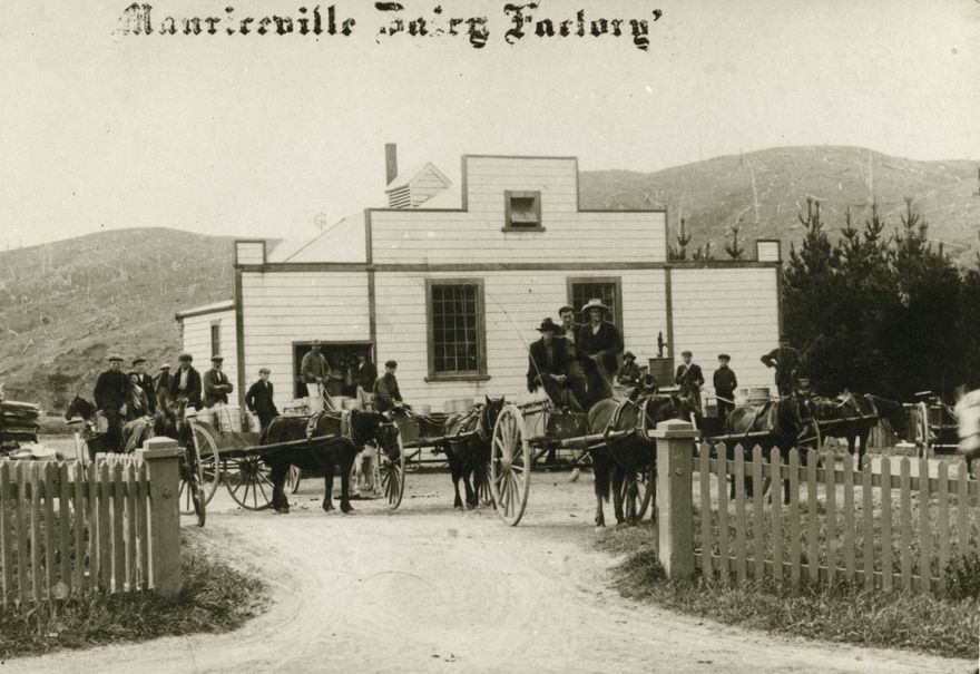 Shown here is the Mauriceville West Dairy Factory, with several groups of farmers waiting to unload their deliveries.