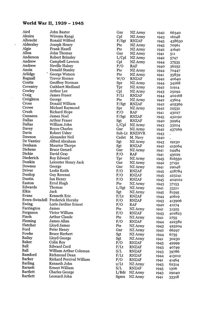 A complete list of all the people named on the Palmerston North War Memorial Cenotaph in The Square, in two parts. The first part is the original WWI names from the 1926 Memorial opening, transcribed in 1990. The second part is a list of names found by the War Research Group set up in 2005 to find all additional known war dead for Palmerston North to that date. The War Research Group consisted of representatives from the Palmerston North City Council, Palmerston North RSA, Palmerston North Officers Club and the Manawatu Standard. Trevor Richards was the researcher