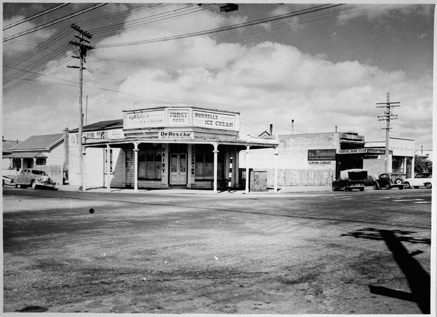 Burrell's ice cream shop and grocery, the Central Book Club and the Bank of New Zealand on the corner of Rangitikei and Featherston Streets.