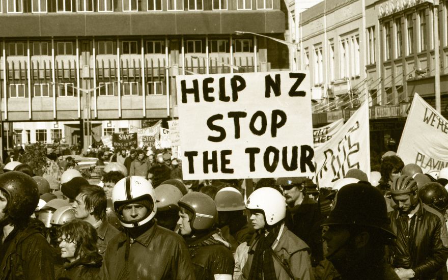 This image was taken (but not used) for a story that ran in The Manawatu Evening Standard on 01 August 1981, depicting the march in protest of the rugby match played between the South African Springboks and the Manawatū provincial team. The march was a coalition of organised responses from representatives and marshals of COST (Citizens Opposed to the Springbok Tour), MAST (Manawatū Against the Springbok Tour) and HART (Halt All Racist Tours) and attracted participants from within the city but also from Wellington and Auckland. HART founder Trevor Richards appears second from right.