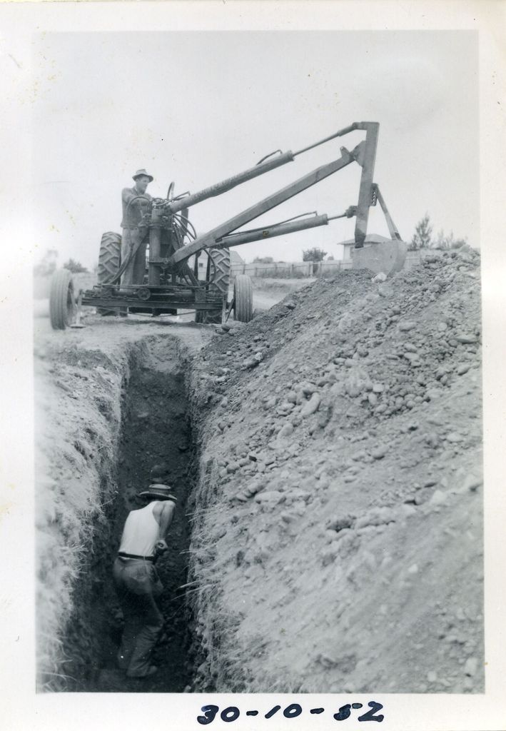 Digger putting in a trench line while a worker shovels below at Memorial Park during the development of the area circa 1953.