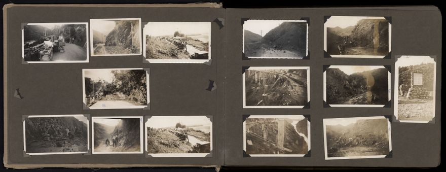Dated from the 1920s and 1930s, this photograph album depicts events on the Manawatū Gorge road including construction and repairs of the road, removing slips, car accidents etc. The album also contains images of Napier following the earthquake of 1931. The photographs were shot by William (Bill) Brockie. Individuals are unidentified.