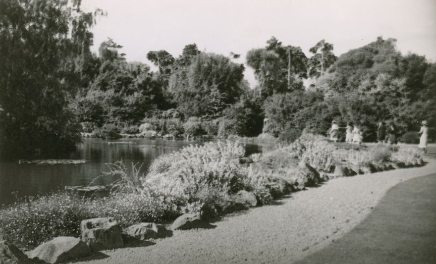 A group of ladies are shown enjoying the walk around the lily pond in the Victoria Esplanade Gardens. The Victoria Esplanade underwent a variety of improvements under Peter Black, the Curator of Reserves from 1908-1946. These included various footpaths, Victoria Drive, mass plantings (notably of the cherry trees and phoenix palms), the creation of a pergola, a tea kiosk, the lily pond the RSA paddling pool and a begonia hothouse (now known as the “Peter Black Conservatory”).