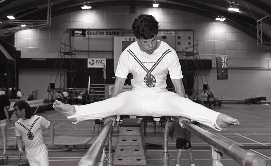 This photograph was published in the Manawatū Evening Standard on 3 December 1990 as part of a group of photographs documenting the Special Olympics National Games. It appeared with the caption: 'Wanganui gymnast Glen Nerney on the parallel bars at the Pascal Street Stadium yesterday. Nerney finished third on the bars and won the gold medal on the vault after scoring a perfect 10.'