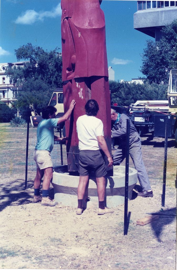 Council staff assisted by John Bevan Ford, install pouwhenua before the re-dedication of The Square as ‘Te Marae o Hine’ – The Courtyard of the Daughter of Peace. The re-dedication occurred on Saturday, 3 March, 1990