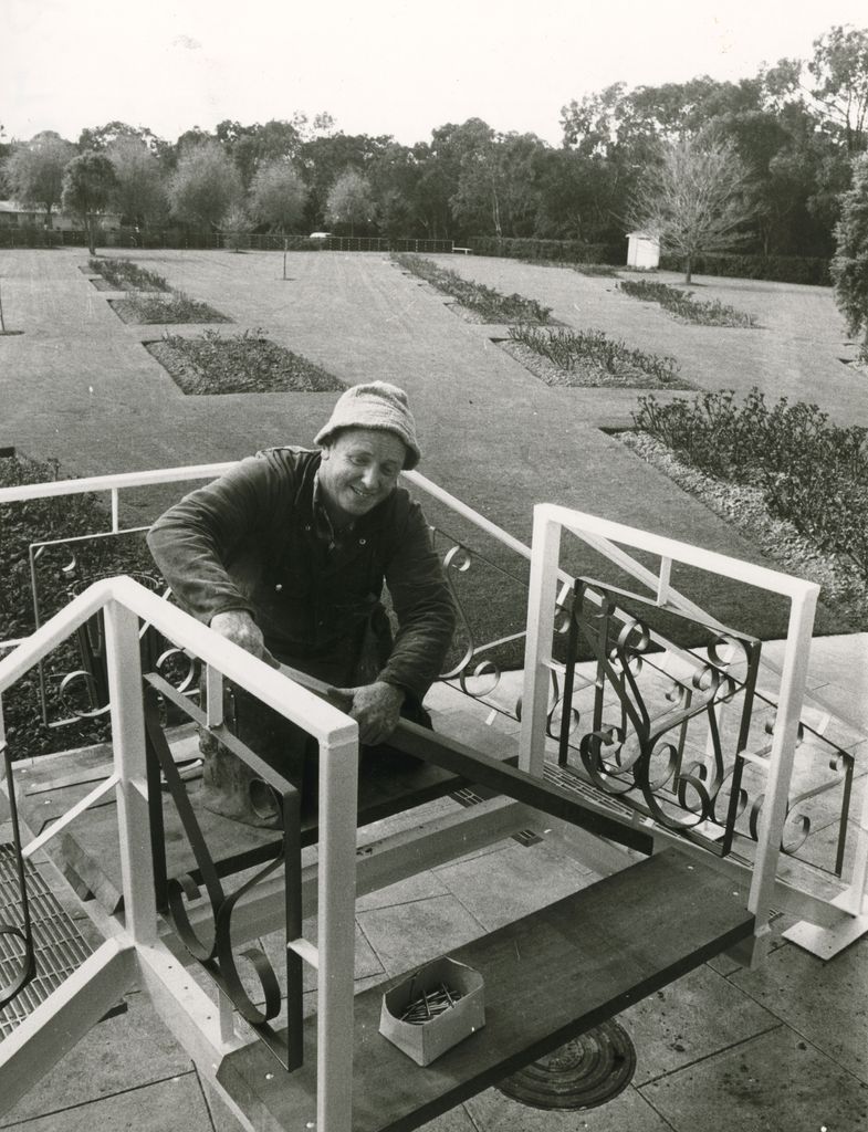 The Dugald MacKenzie Rose Garden was opened in 1968. D. C. MacKenzie was Superintendent of Parks and Reserves from 1946 to 1966. In this photograph, Mr N.H. Funnell is building a raised platform to give visitor s a better a view of the garden.