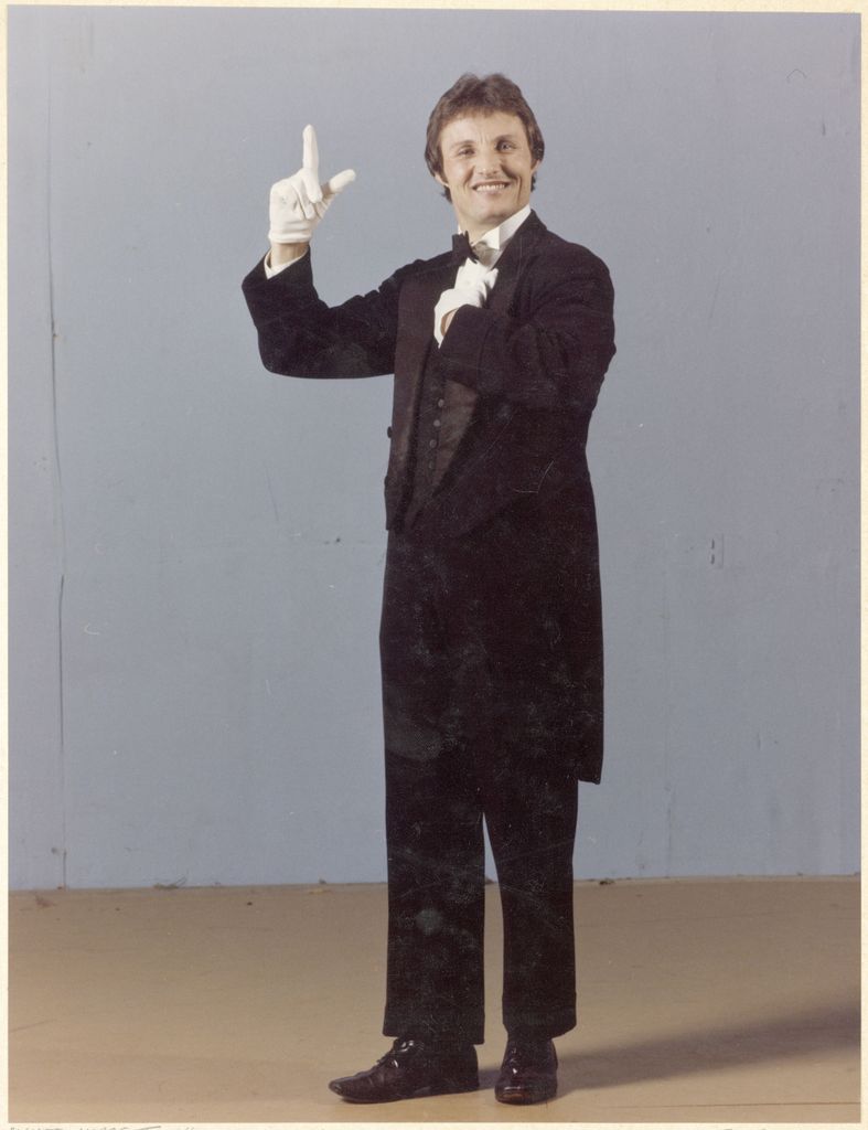 The actor is unidentified. This is a publicity shot from "White Horse Inn" taken by Palmerston North photographer John Cleland. The date is an estimate based on the costuming.