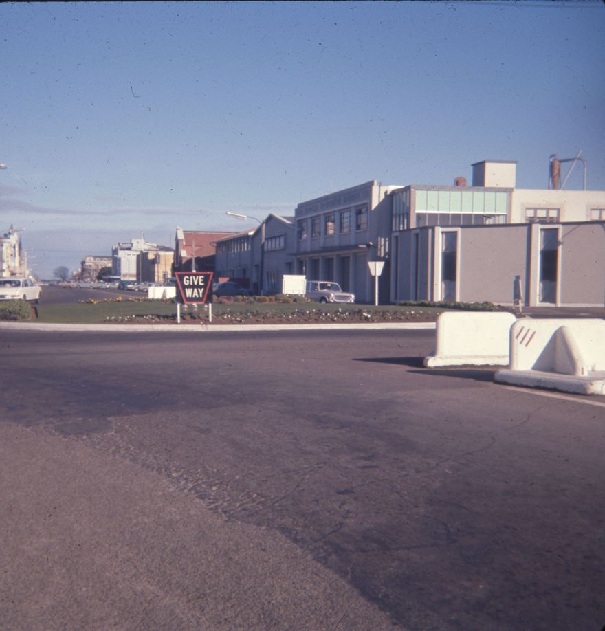 Intersection at the corner of Church and Princess Streets. Farm Products Co-operative Manawatu building is directly behind the roundabout, with the Central Baptist Church, the Police Station and Maple Building directly behind that. The Grand Hotel can be seen in the distance.