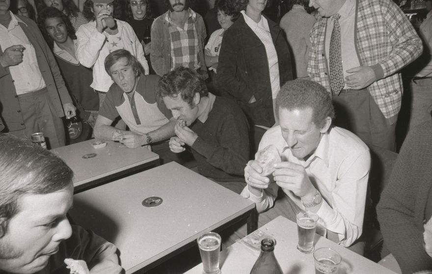 Members of the New Zealand Power Boats Association met in Palmerston North during the weekend of 17-18 May, 1975, for their annual conference and pie eating competition. The competition was held at a Palmerston North tavern, beginning at 2 pm. It took Manawatu boaties, Des Strong and Paul Godbas just 2 minutes 14 seconds to consume 8 pies specially baked for the occasion at a Palmerston North bakehouse. It was the second consecutive win for Manawatu, who took 4 mins 3 seconds to win in 1974. Taranaki boaties were second by a wide margin. Printed in the Manawatu Evening Standard 19 May 1975.