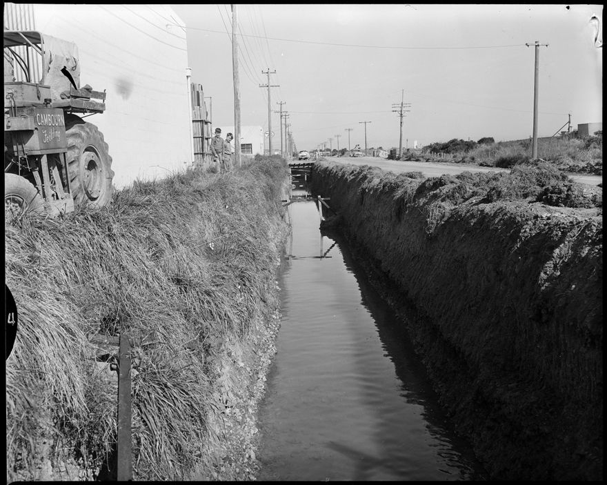 This image was taken for a story that ran in The Manawatu Evening Standard on 01 September 1960 "Surveyors' levels pegs appear to brace the sides of this culvert trench on the left-hand side of Tremaine Avenue. When the picture was taken workmen were awaiting the arrival of the engineer so the next stage of construction could commence. "