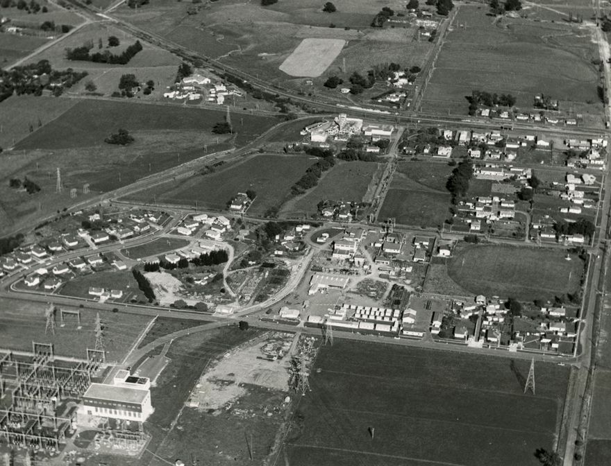 The railway line from Palmerston North runs down at an angle from the top of the photograph, near the left hand corner, and then across to the right hand side. The road from Ashhurst runs from the mid-point of the left hand side up towards the railway line. The Bunnythorpe sub-station can be seen in the lower left hand corner of the photograph and the buildings near the junction of the Ashhurst roads and the railway line is not he disused Glaxo milk powder factory