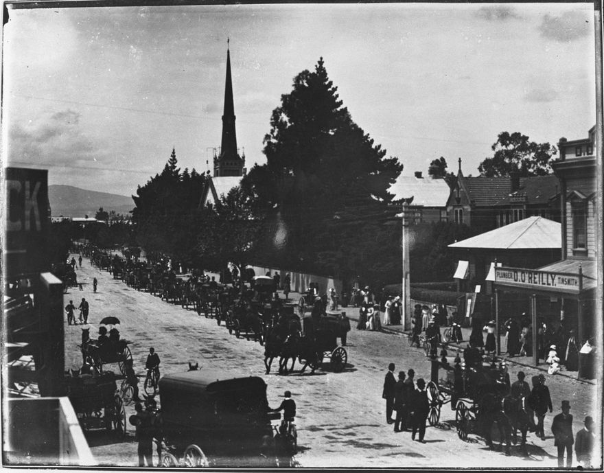 Father Patrick Curtin Costello was the first priest of St Patrick's Catholic church to die in office, 7 December 1912. Born in Ireland, he first came to New Zealand in 1882 and after various postings arrived in Palmerston North in 1905. The funeral procession was said to be very impressive and proceeded from St Patrick's, down Broad Street to The Square, along to the Post Office and up Main Street to the cemetery at Terrace End. The spire of St Patricks can be seen in the background.
