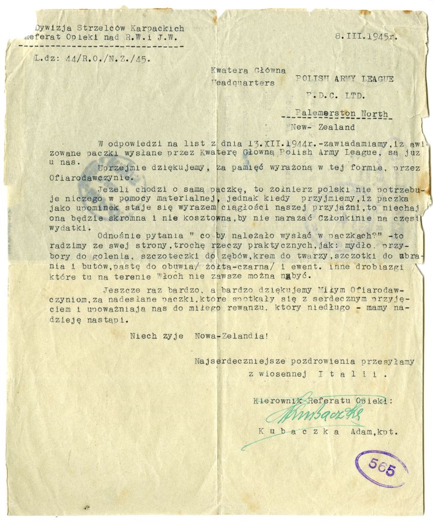 Letter (aerogramme) from Kubaczka Adam, kpt, to the Polish Army League. Written in Polish. The Polish Army League, founded in Palmerston North in WWII, corresponded with and sent parcels to Polish soldiers who served with the allies in World War Two.