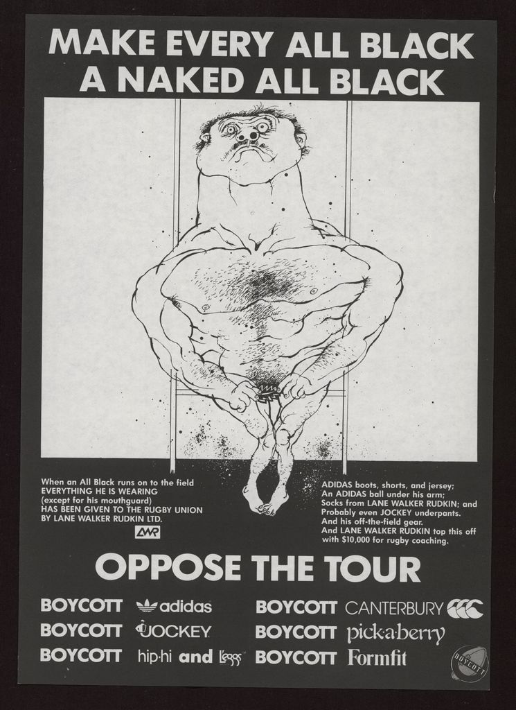 This poster's message is to oppose the tour, through boycotting major businesses who supply uniform apparel to the All Blacks.