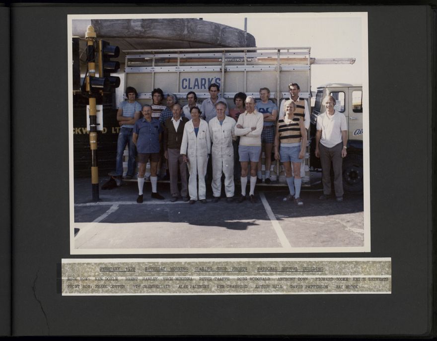 A photograph album from Alexander Clark LTD, a Palmerston North-based home and commercial decoration business. Images include shop displays, staff at work and at social events, and work projects.