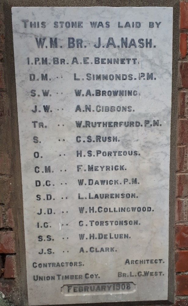 - After the success of the first Masonic Lodge under the English Constitution (the Manawatu United Masonic Lodge, established in 1877), the Manawatu Kilwinning Lodge No. 47 was formed in 1883 under the Scottish Constitution. In 1908 the Manawatu Kilwinning Lodge built its own premises in Church Street. This foundation stone shows the members of the Lodge at that time, including City Councillor and 1909 Mayor James Nash. The building was designed by architect and ex-City Councillor Ludolph Georg West, who was also a member of the Lodge. Lodge member and City Councillor Arthur Bennett's timber company built the building.