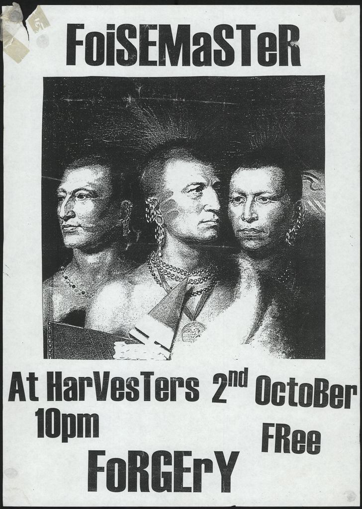 Foisemaster. At Harvesters. 2nd october 10pm. Free. Forgery. Part of a collection of posters that were displayed at The Stomach, Lombard Street, venue for Creative Sounds Society Incorporated.