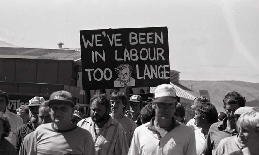 This series of images was taken for a story that ran in on the front page of The Manawatu Evening Standard on 10 February, 1987. The story pertains to the mortgagee auction of a farm owned by Paul Geurtjens of Bulls. Up to 700 protesters attended the auction at Harcourts real estate on Fitzherbert Avenue. Auction proceedings were interrupted by protesters placing false bids and drowning out proceedings. The property was not sold as it didn’t raise a bid. The images of Longburn workers protesting appear on the same roll of film, however it is unclear if these are from the same event.