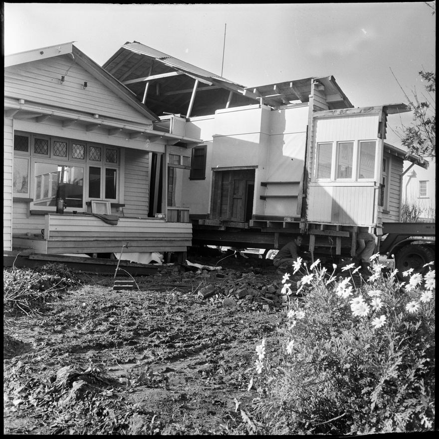 This image was taken for a story that ran in the Manawatu Evening Standard on 30 May, 1963. "Two houses at 95 and 97 Heretaunga Street, owned by the Palmerston North Hospital Board, were removed to another site. This valuable site will be used for the construction of a bulk store for the board. One half of the two homes is seen being removed."