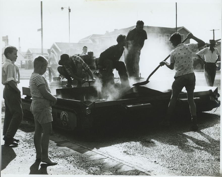 Workmen and a tar-sealing machine operating in what is presumed to be Palmerston North.