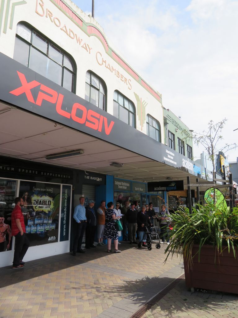 Local History Week is an annual event run by the Palmerston North City Library. Here tour leader, Cindy Lilburn leads a group along Broadway. They are outside the Broadway Chambers building, built in 1936.