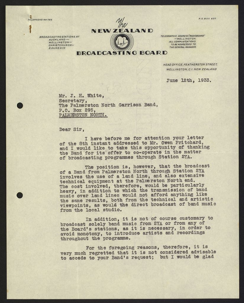 Letter from NZ Broadcasting regarding a request by the band to broadcast programmes through the 2YA radio station. The letter is addressed to J H White, Secretary of the band. The letter is from the Palmerston North Garrison Band archive