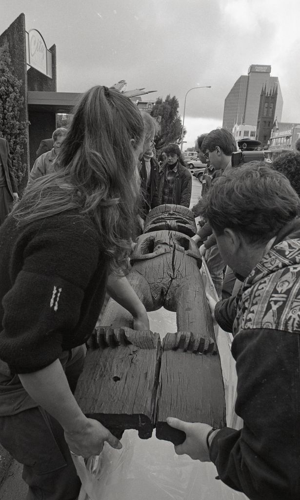 This image was taken (but not used) for a story that ran in The Manawatu Evening Standard on 4th August 1993. "The air was thick with emotion when four Rangitāne pouwhenua (carved stockade posts) were returned home yesterday after an absence of 60 years. Originally from Puketotara Pa, the pouwhenua were considered significant and important taonga for the Rangitāne people. They were the only large Rangitāne carvings still in New Zealand, and four of seven in existence. In 1933, Wiremu Kingi Te Awe Awe presented the carvings to the then Dominion Museum for safekeeping. There they were displayed in the Māori Hall for many years. Today, a delegation from the Museum of New Zealand, Te Papa Tongarewa, led by board chairman Sir Hamish Hay and Māori art and history director Cliff Whiting, handed over the carvings on a permanent loan basis to the Manawatu Museum. They will form a major component of the exhibitions in the new Manawatu Museum - Science Centre, opening in February next year. Mr. Whiting said the decision to return the carvings to their area of origin was part of the New Zealand Museum's policy of partnership with other museums. [Pictured] One of the four Rangitāne pouwhenua, returned to the Manawatu yesterday, is unveiled in preparation for transportation to a wing of the Museum's new premises."