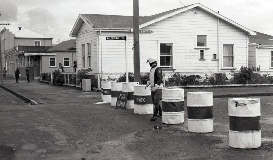This image was taken (but not used) for a story that ran in The Manawatu Evening Standard on 01 August 1981. Barbed wire was erected around the Showgrounds and barricades blocked parts of Cuba Street in anticipation of anti-Apartheid and anti-Springbok Tour protests during the rugby match played between the Springboks and Manawatū on 1 August 1981.