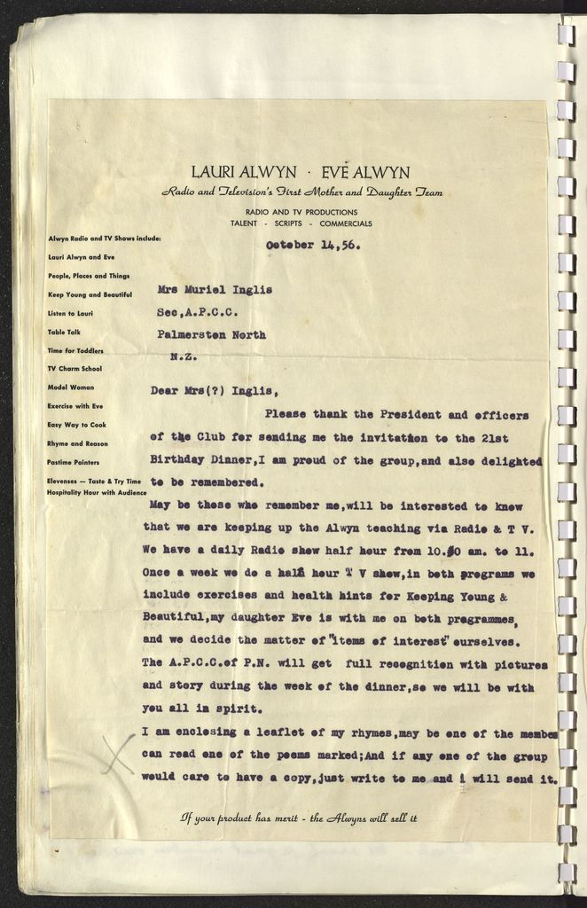 Reply to invitation to the 21st birthday celebrations of the Alwyn Physical Culture Club